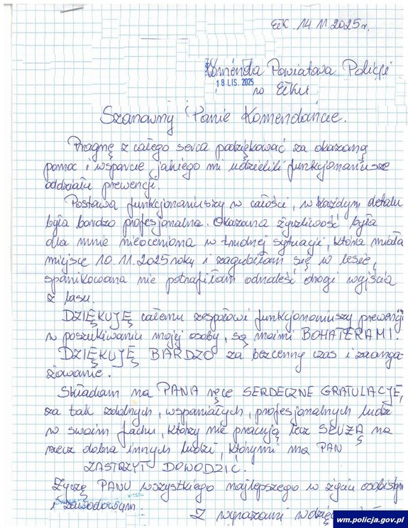 „Są moimi bohaterami...”- tak o policjantach z ełckiej prewencji napisała mieszkanka, która podziękowała funkcjonariuszom za szybkie odnalezienie jej w lesie i okazane wsparcie podczas stresującej sytuacji.